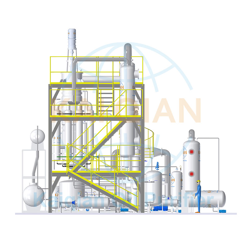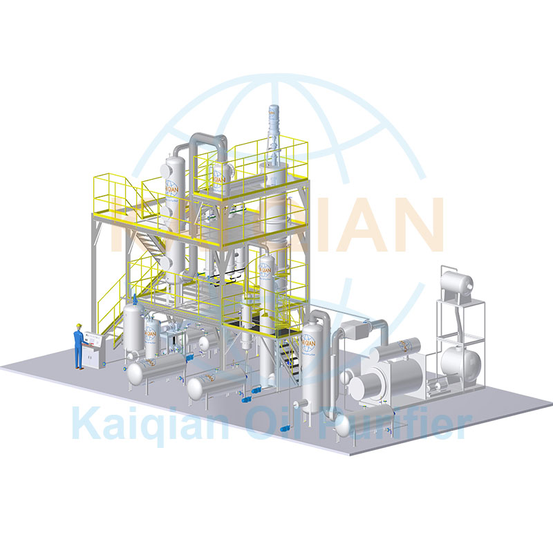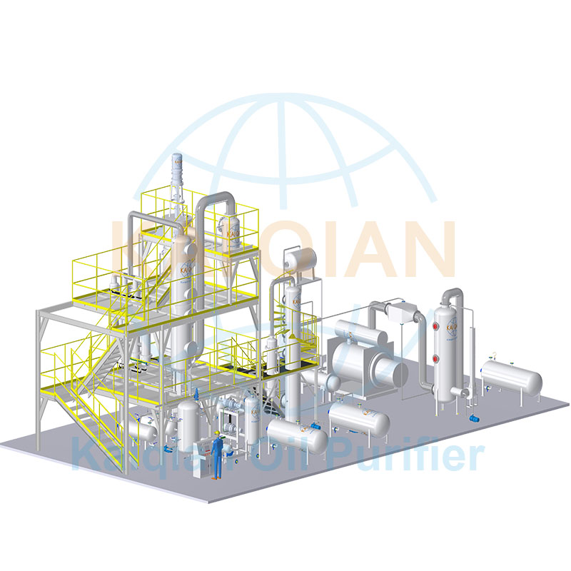 以廢舊輪胎、廢舊塑料熱裂解處理的固體垃圾回收油品再利用的技術,已經在世界范圍內得到快速推廣,不但消除了部分固體白色垃圾對環境的污染,而且實現了能源的再生利用,但是廢輪胎、廢塑料熱裂解后的毛油,大部分應用是作為熱能燃料。因裂解過程中會產生炭黑,炭黑隨著油氣進入冷凝系統,故油品顏色較黑,雜質較多,且熱值不高,利用率較低;而少數采用簡單脫色沙對油品進行簡易處理,此技術處理精度較低,加工過程中油品損失嚴重,而且脫色沙過后的油品化學性質不穩定,極容易被氧化,造成油品顏色變黑,雜質多,經濟效益損失較大,可采用高真空精餾設備裝置對塑料輪胎毛油精煉提純得到更清潔透明的燃料油。