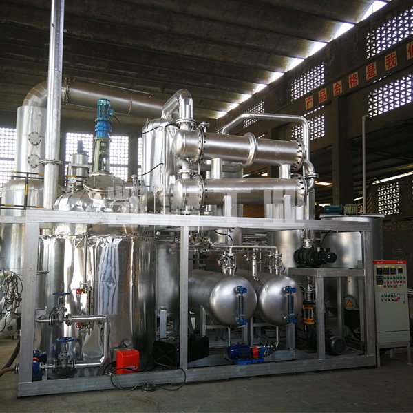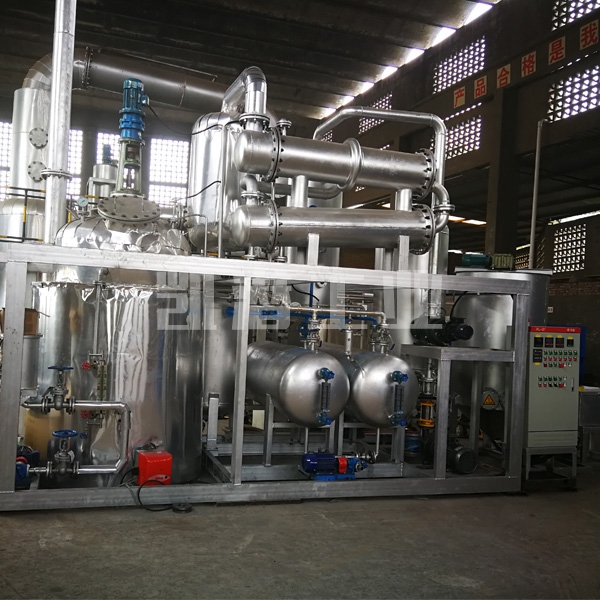 廢輪胎油煉油設備采用高真空減壓精餾技術,減壓工藝,靠不同物質的分子運動平均自由程的差別來實現液-液分離。其分子運動的自由程是指一個分子相鄰兩次碰撞之間所走的路程。當油液受熱后,輕、重分子會溢出液面而進入氣相,由于輕、重分子的自由程不同,因此,不同物質的分子從液面溢出后移動的距離也不同,從而實現物質分離的目的。減壓蒸餾技術不僅加快了分子溢出時間,還提高了出油率。