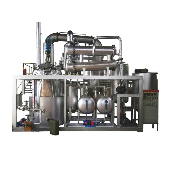 廢輪胎油煉油設備適用于輪胎裂解毛油、塑料裂解毛油的精餾提純,該工藝在高真空環境中對裂解后的輪胎油、塑料油進行減壓精餾產出高品質燃料油,從而提高裂解油的市場用途。