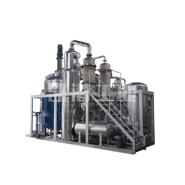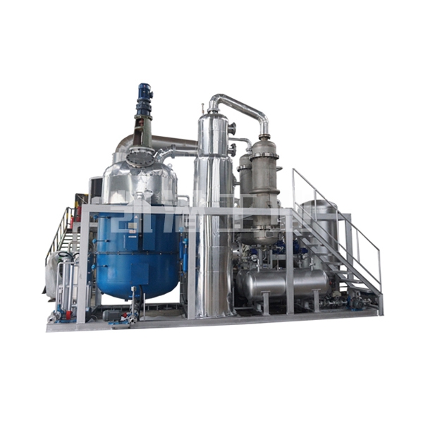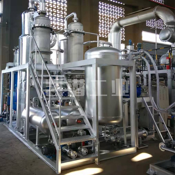 廢油脫色提煉設備工藝采用國內先進的減壓薄膜分子閃蒸技術,高真空條件(jue對壓力10Pa)下可在較低溫度下將高粘度組分的潤滑油蒸餾出來,同時也降低高溫裂解、聚合、設備堵塞等問題的發生。無酸渣、廢酸、廢水等二次污染物的產生,是一種清潔、環保、投資適當的凈化工藝。